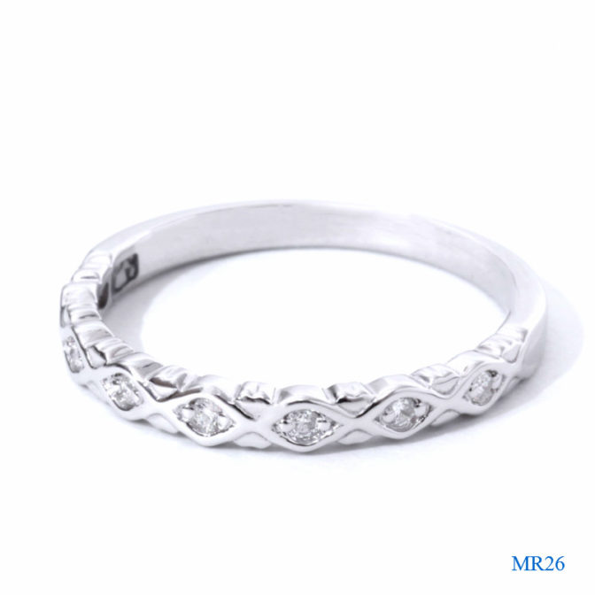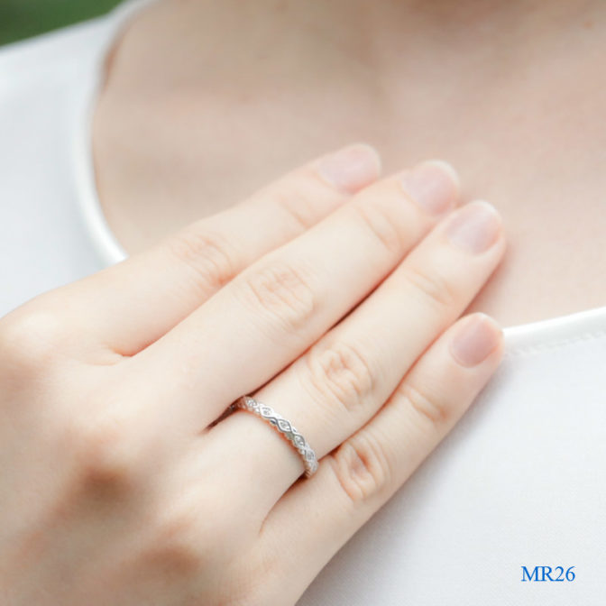| デザイン | 編み込んだような堀のデザインの中に、ダイヤモンド7石を留めました。 指に着けるととても美しいです。 一般的な結婚指輪くらいのボリュームです。 |