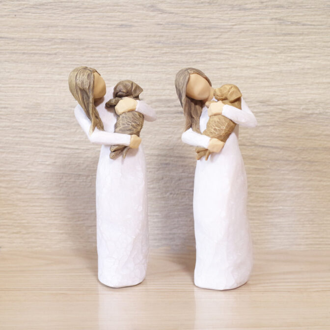 WillowTreeシリーズは、アメリカ人アーティストスーザンローディ(米国ミズーリ州在住)の手によってデザインされた彫刻作品です。大きな特徴として、人形でありながら顔を持たず、体のひねりやしぐさによって人生のシーンや感情を表現しているところです。アメリカやヨーロッパではギフトコレクションアイテムとして大変人気があり幅広く認知されています。 多くの方に手元に置いて頂くため、 |