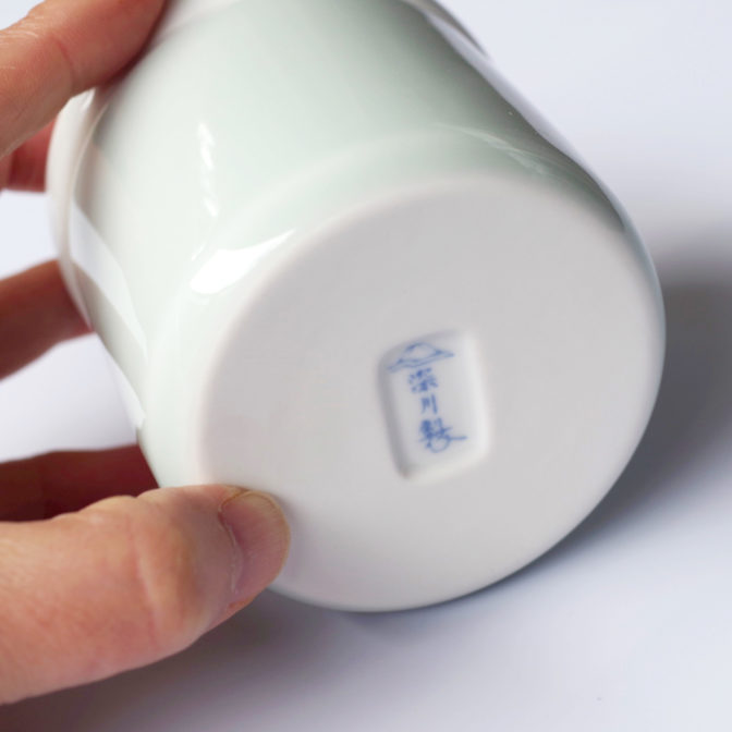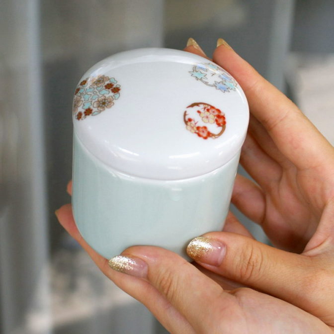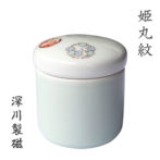 ネジ構造でしっかりと閉まる蓋です。約2寸。やさしい色合いで姫丸紋の絵柄がとてもかわいらしい骨壷です。