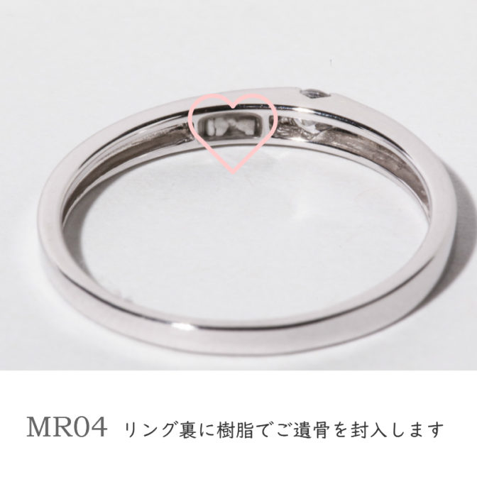 | 封入されるご遺骨 | リングの内側の溝にお預かりしたご遺骨(耳かき1~2さじ程度の量)を透明な特殊樹脂で液体から硬化させることにより貴金属と一体化させます。※MRシリーズは立会封入は行っておりません。 |