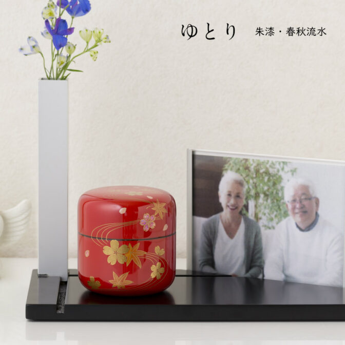 蒔絵 ゆとり [朱漆・春秋流水] のど仏が納まるゆったりとした口径の漆塗り骨壷